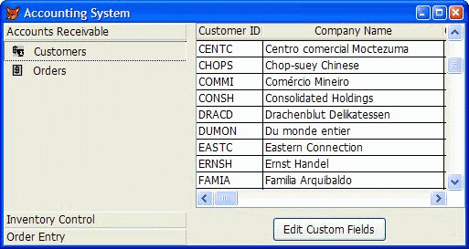 TestToolbox.SCX es un formulario de ejemplo basados en SFToolboxForm. Esto utiliza una caja de herramientas para mostrar los diferentes módulos en una aplicación contable. Lea tres módulos desde una tabla MODULES, el que contiene registros para las categorías (tales como "Cuentas admisibles" y "Entrada de órdenes") y el módulo debajo de cada uno (como "Usuarios" y "Ordenes") Tiene el siguiente código en GetCategories, el método llamado por ShowToolbox para llenar una colección de categorías.